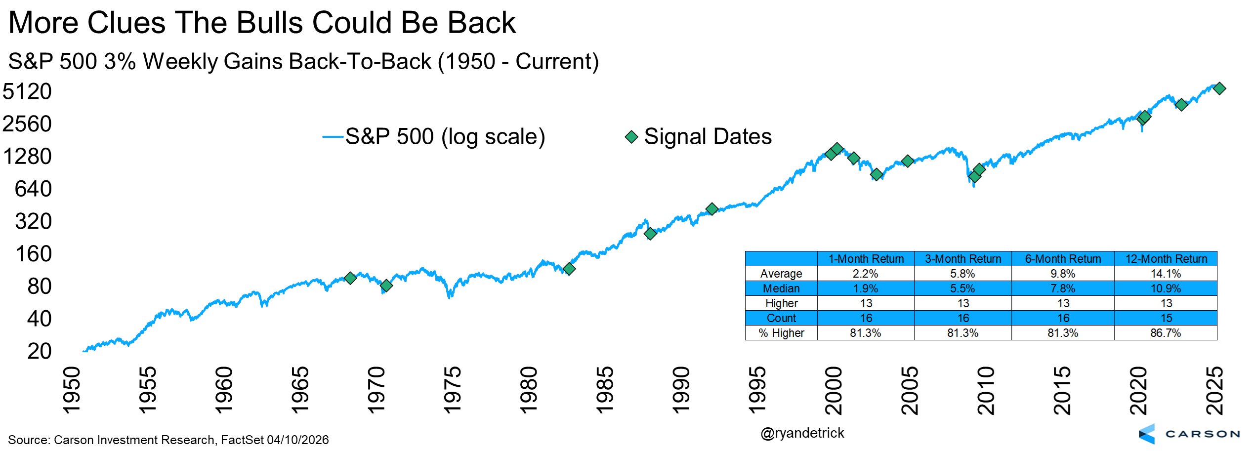 - Ryan Detrick, CMT@RyanDetrick – 4-10 – More good news for the bulls. S&P 500 up >3% back to back weeks is historically quite bullish. Above average returns across the board and higher a year later 86.7% of the time.