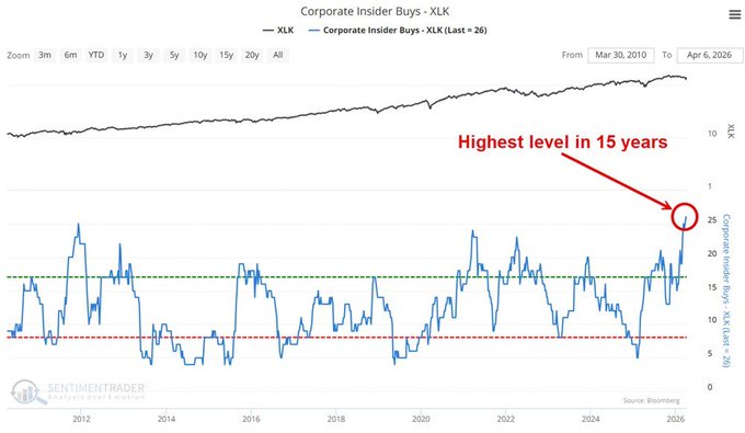 - Seth Golden@SethCL – 4-10 – I’m not in the business of betting against the INSIDERS. As evidenced by the chart, this is the highest level of Tech Insider buying we’ve seen in the last 15 years. That seems like a pretty powerful signal juxtaposed with highest Tech sector Y/Y EPS growth since 2021. They know their earnings potential better than anyone! $SPX $XLK $AAPL $NVDA $MU $AVGO $PLTR $MSFT $IGV $SPY $QQQ $NDX h/t @jaykaeppel