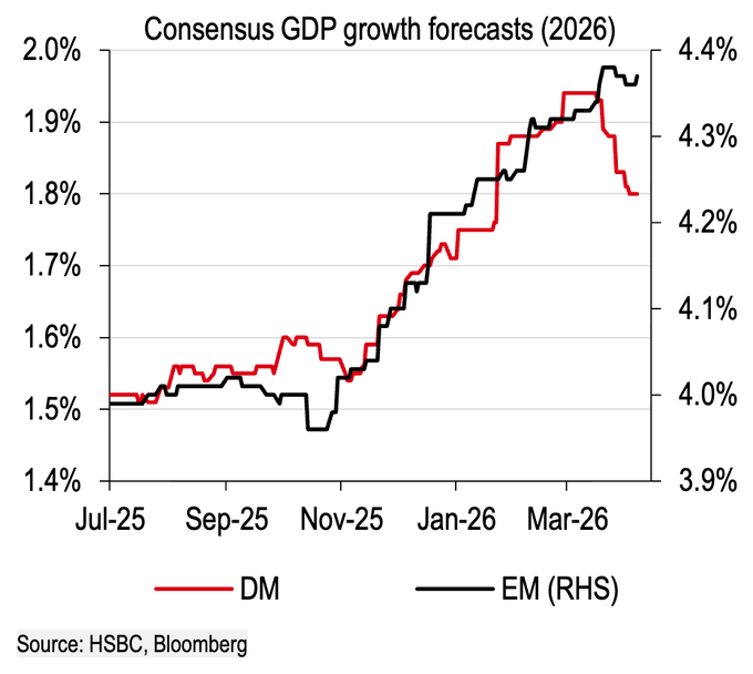 - (((The Daily Shot)))@SoberLook 4-10 – Growth expectations have rolled over for developed markets, but have held up for EM. Source: @HSBC