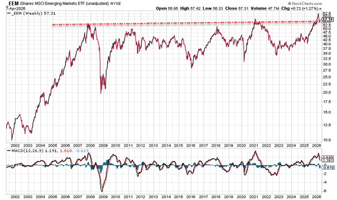 - Ryan Detrick, CMT@RyanDetrick – Most important chart in the world? Emerging markets broke out and tested their peak from 2007. So far, this important area is holding. Again, bullish action for the bull market we are in right now.