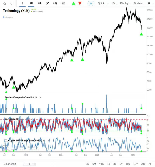 Seth Golden@SethCL – 4-4 – Sentiment washout; • Buy Signal Triggered: Extreme pessimism has triggered a rare Optix buy signal ; • High-Probability Setup: When paired with a Composite Washout Model reading ≥ 22%, this setup historically boasts an 87% win rate over a 3-mnth time frame $SPX $XLK $AAPL $SMH $NVDA $MSFT $IGV $PANW $PLTR $QQQ $NDX h/t